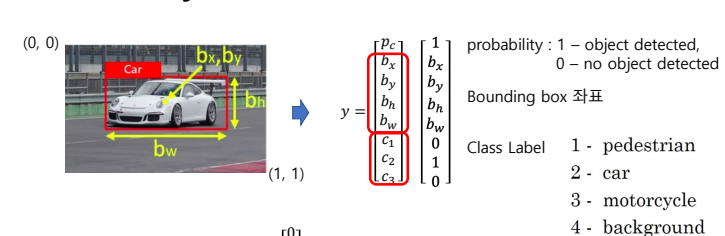 → 1 : ์์ / 0 : ์์ - ๋ฐ์ด๋ฉ ๋ฐ์ค ( \( b_x, b_y, b_h, b_w \) ) : ์ค์ฌ์ ์ด ์ด๋์๋์ง๋ฅผ ๋ํ๋