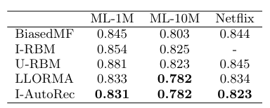 - LLORMA ์์ ๋น๊ต : ์ฑ๋ฅ์ ๋น์ทํ๋, AutoRec์ ๋จ์ผ autoencoder ๊ธฐ๋ฐ์ด๋ผ๋ ์ ์์ ์ค์ํจ