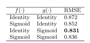 - hidden layer์ ๋น์ ํ ํ์ฑํ ํจ์๋ฅผ ์ ์ฉ ์, ์ฑ๋ฅ ํฅ์์ ๊ฒฐ์ ์ → MF๋ณด๋ค ์ฐ์ํ ๋น์ ํ ํํ๋ ฅ์ ๊ฐ์ง์ ์๋ฏธํจ